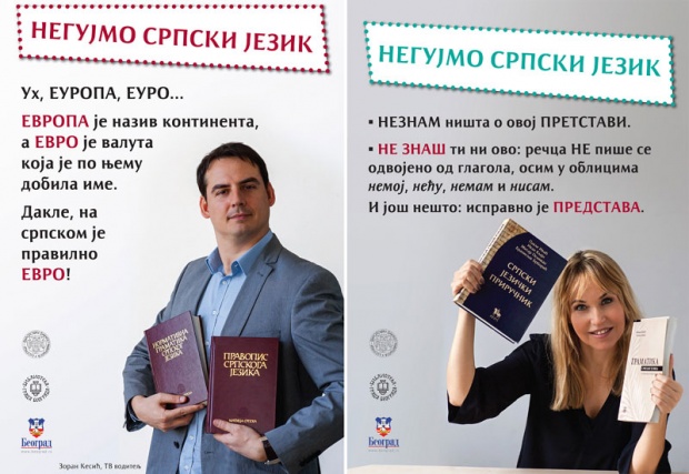 Poruke u okviru akcije “Negujmo srpski jezik” nalaze se na beogradskim bilbordima i u televizijskim spotovima, a promovišu ih poznata glumačka, književna, muzička i novinarska lica. EVROPA je naziv kontinenta, a evro je valuta koja je po njemu dobila ime. Dakle, na srpskom je pravilno evro, a ne euro! Ovo je jedna od poruka u okviru nove beogradske akcije “Negujmo srpski jezik”, koje su od juče na beogradskim bilbordima i u televizijskim spotovima, a promovišu ih poznata glumačka, književna, muzička i novinarska lica: Anica Dobra, Aca Seltik, Tihomir Stanić, Ljubica Arsić, Dragan Ilić, Goran Gocić, Živana Šaponja Ilić, Zoran Kesić, Nataša Marković, Marčelo i Svetislav Goncić.