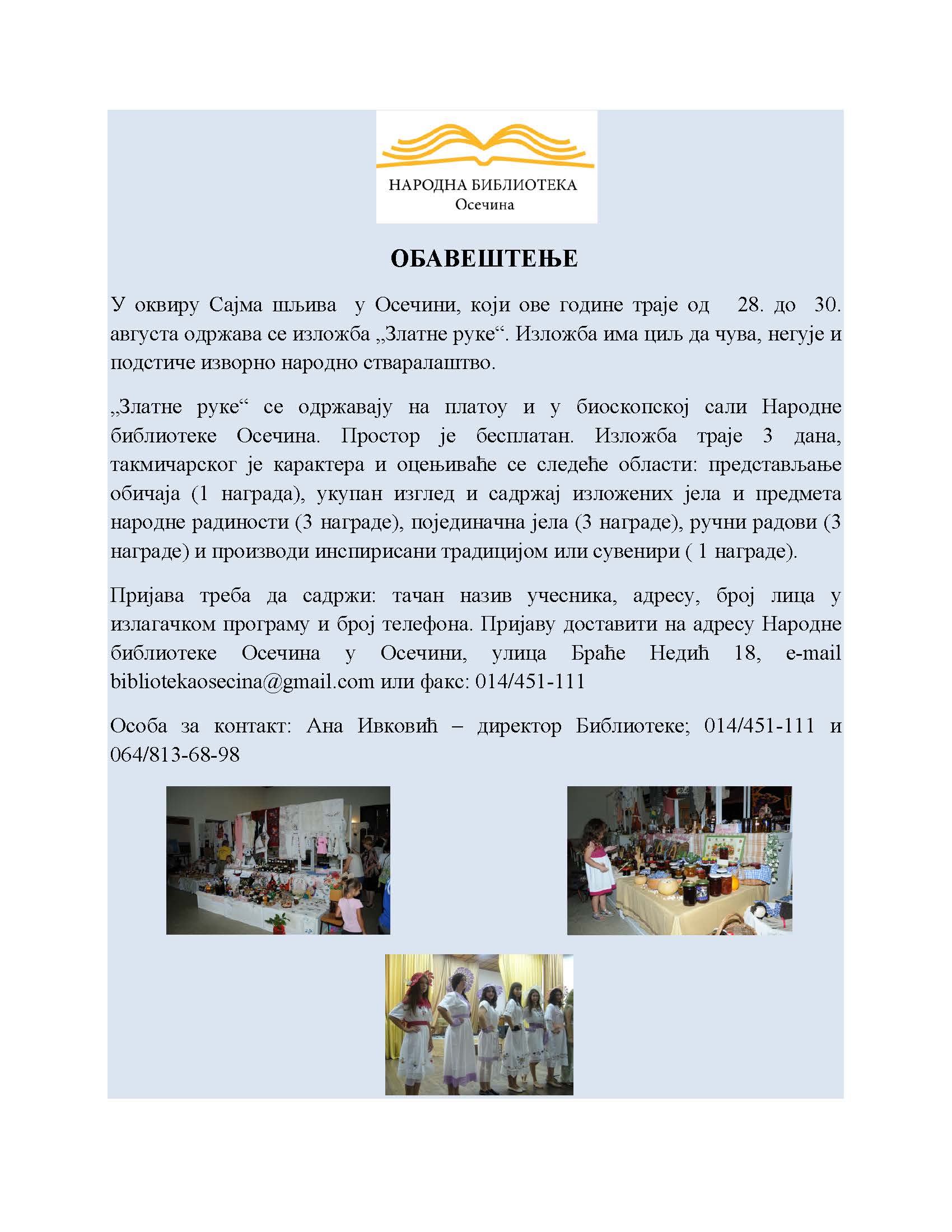 Narodna biblioteka Osečina kao jedina institucija kulture na teritoriji opštine Osečina deo je privredno-turističke i kulturne manifestacije “ Sajam šljiva“, koji se ove godine održava u periodu od 28. do 30. avgusta. Biblioteka organizuje takmičenje u govorenju zdravica i izložbu tradicionalnih jela i ručnih radova „Zlatne ruke“. Više je razloga da obavezno posetite ove godine 10. jubilarni Sajam šljiva u Osečini koji traje od 28. do 30. avgusta…