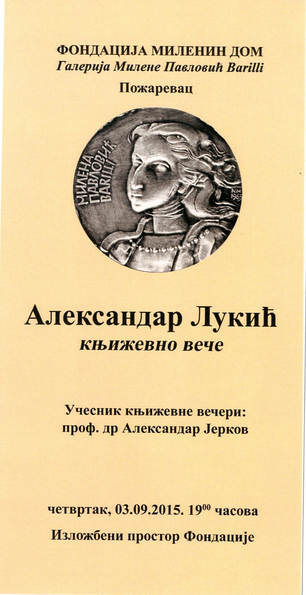 Aleksandar Lukić, književnik iz Požarevca održaće književno veče u Galeriji Milene Pavlović Barilli u Požarevcu. Datum: četvrtak 03.09.2015. godine u 19h. Dobro došli…