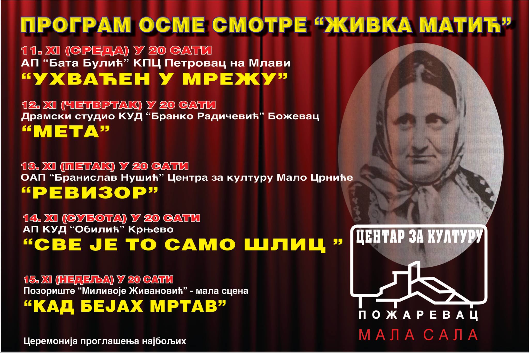 Osma smotra dramskih amatera Podunavlja i Pomoravlja „Živka Matić“ u čast naše legendarne glumice, održaće se u Centru za kulturu Požarevac, od 11-15. novembra 2015. godine. Sve predstave počinju u 20h.