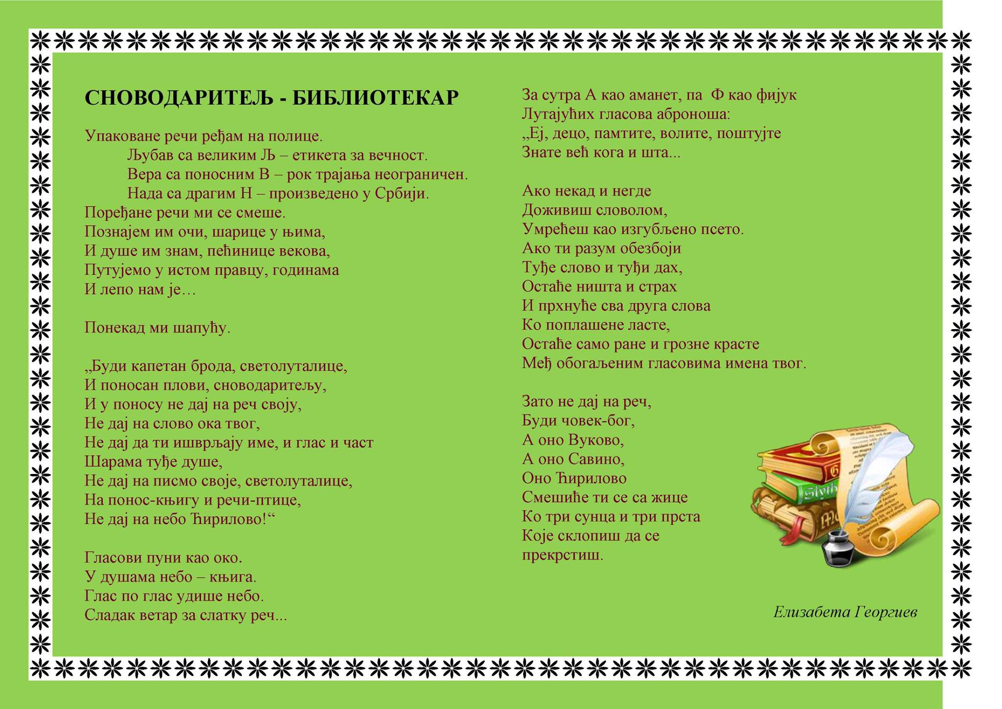 Podelila bih sa vama ove dve lepe pesme o biblioteci i o bibliotekarima koje je napisala koleginica Elizabeta Georgiev iz Narodne biblioteke u Dimitrovgradu.