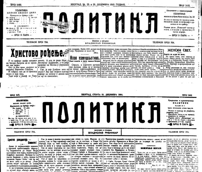 Pre Prvog svetskog rata, i srpska država i crkva Božić su proslavljale 25. decembra po starom, julijanskom kalendaru. O tome svedoče i naslovne strane „Politike” iz tog perioda. Tako su, na primer, u prazničnom trobroju našeg lista od 24, 25 i 26. decembra 1910. objavljeni prigodni božićni tekstovi, a uz tradicionalni pozdrav „Hristos se rodi” svim čitaocima i čitateljkama praznik je čestitalo uredništvo „Politike”. U istom broju, objavljena je i reportaža o pripremama za proslavu Božića na dvoru kralja Petra Karađorđevića. Navodi se da se „kralj Petar sprema da dočeka praznik isto onako kao i njegovi podanici”.