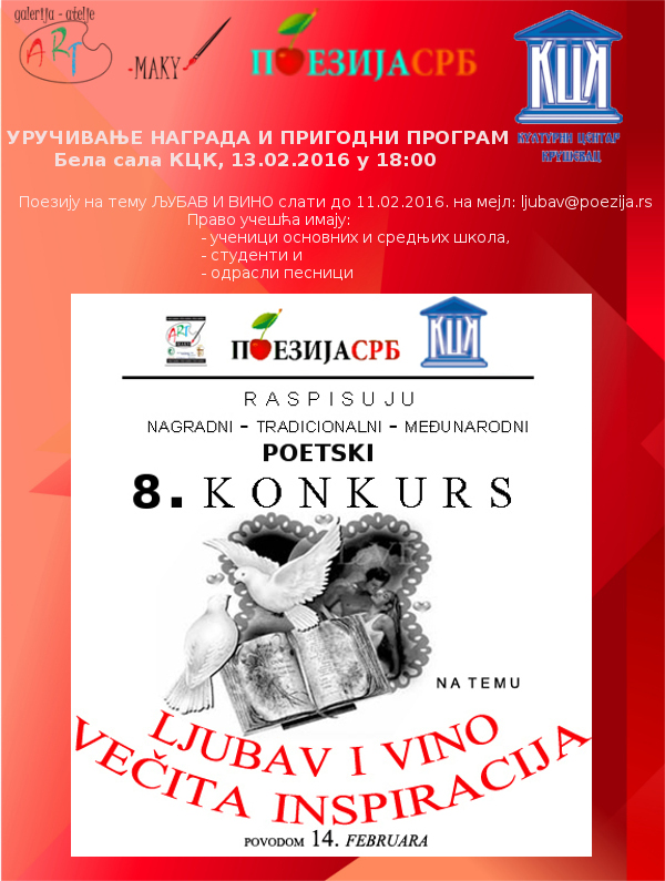 Povodom Dana zaljubljenih i Svetog Trifuna (14. februar), Udruženje pesnika Srbije – PoezijaSRB u saradnji sa Ateljeom galerije MAKY iz Kruševca i Kulturnim centrom Kruševac raspisuje 8. medjunarodni poetski konkurs na temu:
