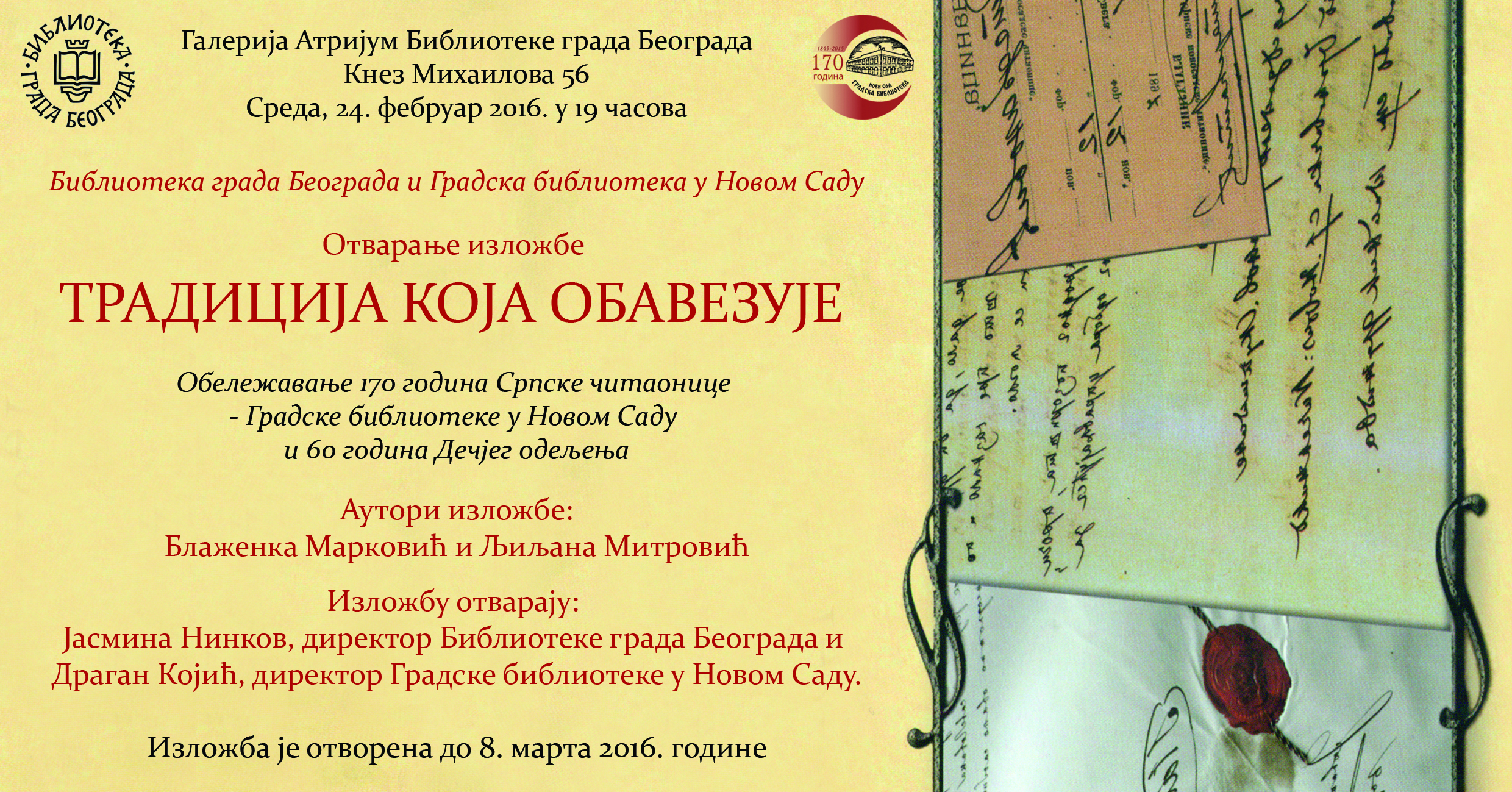 У среду, 24. фебруара 2016. године у 19 часова у Галерији Атријум Библиотеке града Београда отвара се изложба „Традиција која обавезује“ поводом обележавања 170 година Српске читаонице – Градске библиотеке у Новом Саду и 60 година Дечјег одељења. Аутори изложбе су Блаженка Марковић и Љиљана Митровић, библиотекарке Завичајне збирке Градске библиотеке у Новом Саду. Изложбу је организовала Библиотека града Београда у сарадњи са Градском библиотеком у Новом Саду.