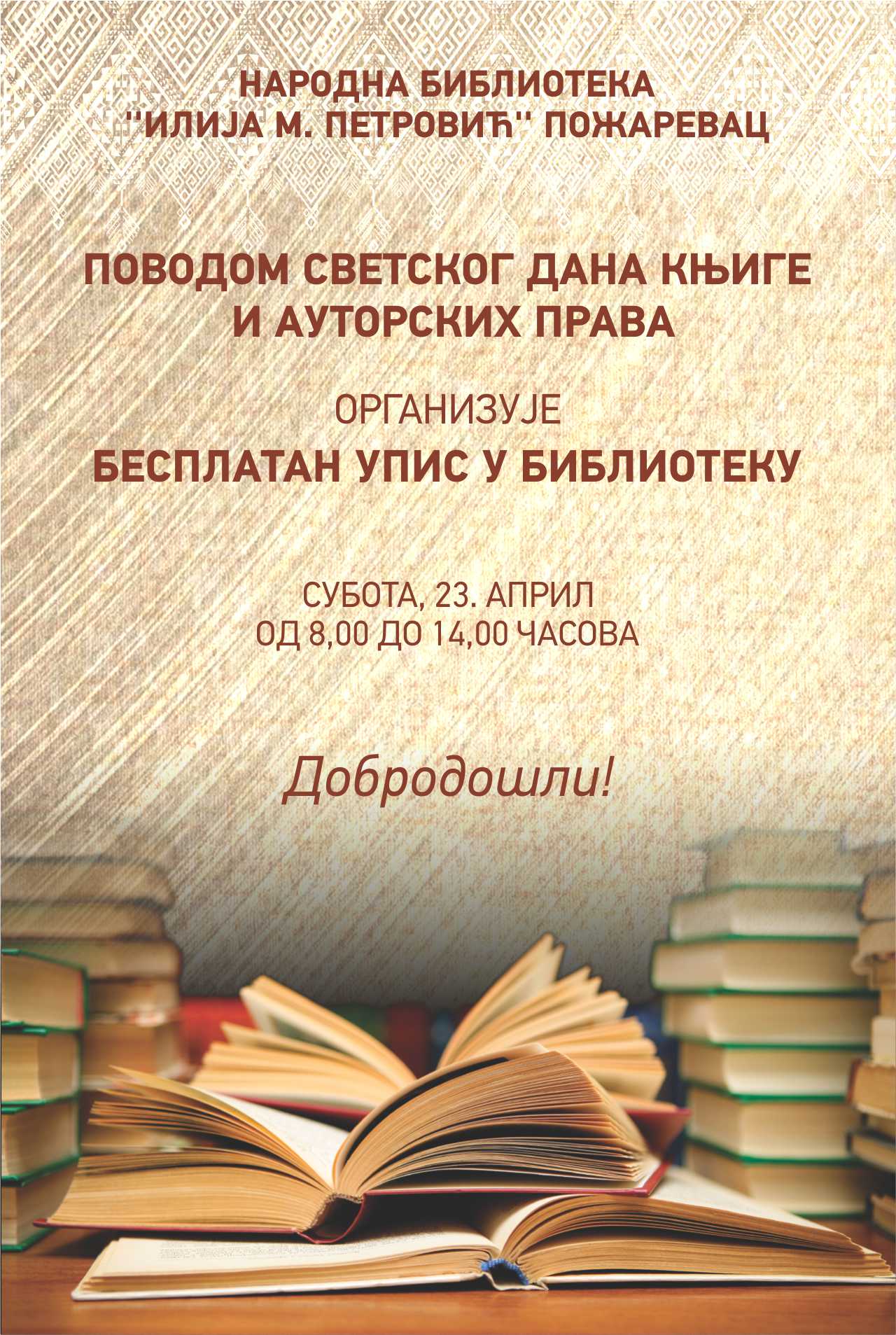 Obaveštavamo Vas da će Narodna biblioteka „Ilija M. Petrović“ u Požarevcu obeležiti 23. аpril – Svetski dan knjige i autorskih prava organizovanjem predavanja Dejana Ristića o osnivanju Narodne biblioteke Srbije i projekcijom dokumentarnog filma Sećanje iz pepela u petak, 22. aprila 2016, u 19h u sali na spratu Biblioteke u Požarevcu, a u Оdeljenju u Kostolcu biće predstavljanja knjiga Slavice Pejović Ispis i struj. U subotu 23. aprila 2016, u periodu od 8-14h u Biblioteci u Požarevcu i Odeljenju Biblioteke u Kostolcu biće organizovan besplatni upis u Biblioteku za 2016. godinu. Očekujemo Vaše prisustvo.