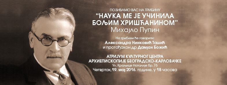 У четвртак, 19. маја 2016. године, у 18:30 часова, у Атријуму културног центра Архиепископије београдско-карловачке (Краљице Наталије 76) одржаће се трибина на тему „Наука ме је учинила бољим хришћанином“ – Михајло Пупин. О овој теми говориће: Александра Нинковић-Ташић (Образовно-истраживачко друштво ,,Михајло Пупин“) и протођакон др Дамјан Божић. Трибина се одржава у организацији Светосавске омладинске заједнице Архиепископије београдско-карловачке. Улаз је слободан.