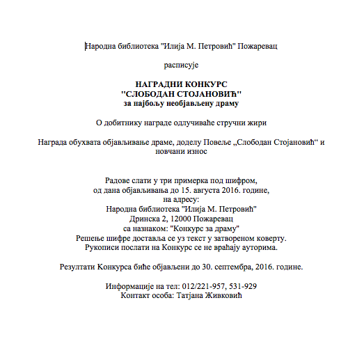 Народна библиотека „Илија М. Петровић“ Пожаревац расписује наградни конкурс „Слободан Стојановић“ за најбољу необјављену драму. Награда обухвата објављивање драме, доделу повеље „Слободан Стојановић“ и новчани износ. Рок за доставу радова је 15. август 2016. године.