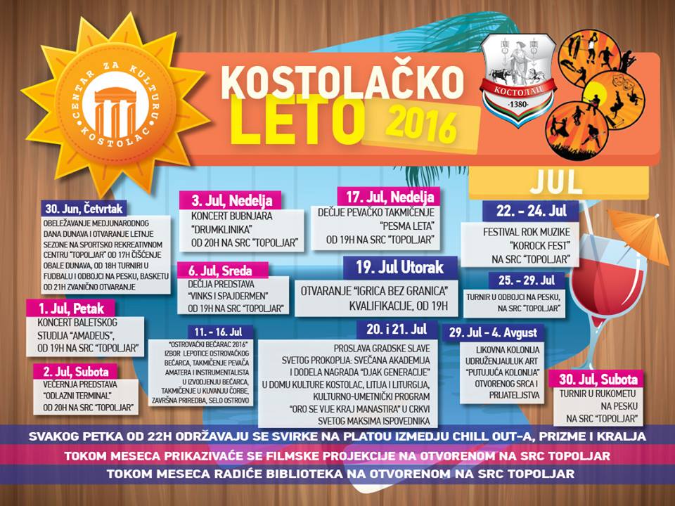 Отворен је конкурс за певачко такмичење младих талената „ПЕСМА ЛЕТА 2016“. Сви заинтересовани за учешће могу да се пријаве до суботе, 16. јула, а потребно је да попуне пријаву и доставе је електронским путем (на мејл адресу czkkostolac@gmail.com ) или лично у канцеларији Центра за културу Костолац. Пријаву и правила такмичења можете пронаћи на сајту ГО Костолац или слањем директних порука фејсбук страни Центра за културу Костолац, као и слањем мејла на горе поменуту адресу.