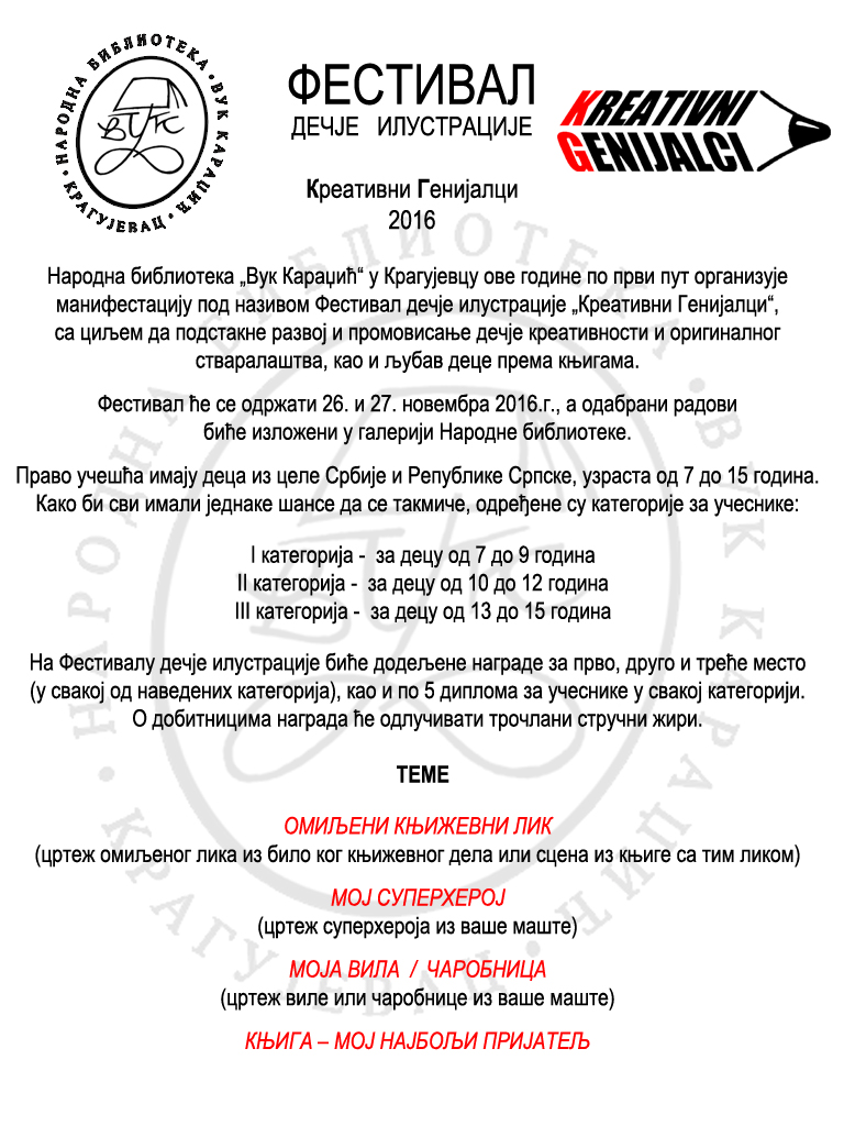 Festival dečje ilustracije „Kreativni genijalci“ u organizaciji Narodne biblioteke „Vuk Karadžić“ u Kragujevcu je nagradnog karaktera i ove godine će se održati po prvi put. Pozivamo na učešće sve zainteresovane učenike osnovnih škola u Srbiji i Republici Srpskoj. O Festivalu možete se više informisati na njihovom blogu ili Facebook stranici.