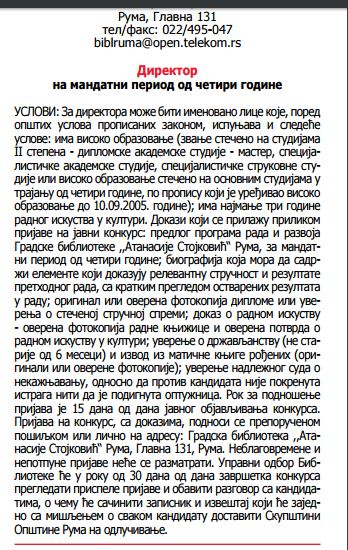 Конкурс за директора библиотеке у Руми