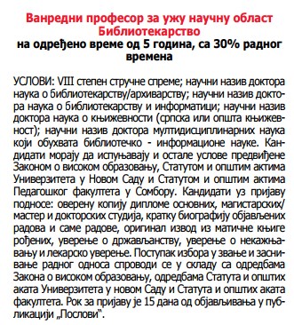 Конкурс за ванредног професора библиотекарства на Педагошком факултету у Сомбору