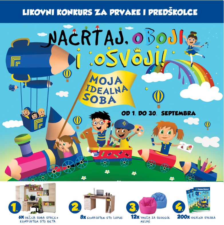 Kompanija Forma Ideale ove godine tradicionalno organizuje dečiji likovni nagradni konkurs NACRTAJ, OBOJI, I OSVOJI koji je namenjen deci predškolskih ustanova u Srbiji, kao i klincima i klincezama koji ovog septembra polaze u prvi razred. Vredne nagrade. Konkurs je otvoren od 1-30. septembra 2016. godine. Više o propozicijama konkursa pročitajte ovde.