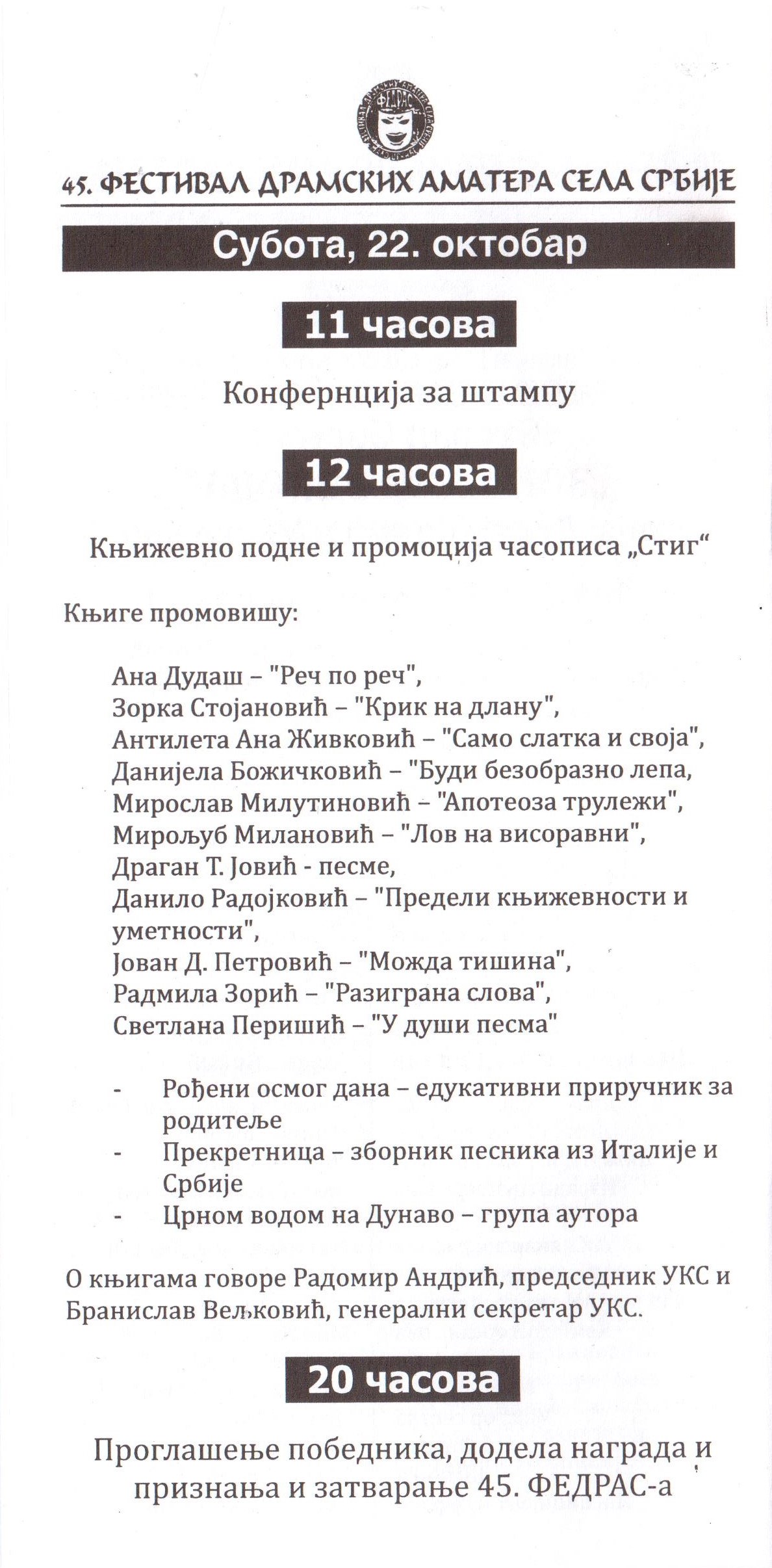 О издавачкој продукцији браничевско-стишке књижевне заједнице говориће: Миљурко Вукадиновић и Радомир Андрић.