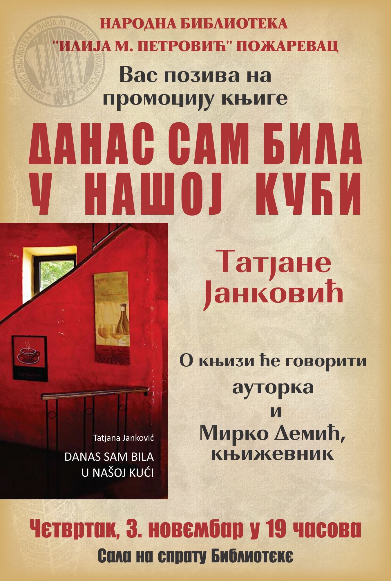 У четвртак 3. новембра 2016. године у 19 сати у Библиотеци у Пожаревцу, биће одржана промоција књиге Данас сам била у нашој кући ауторке Татјане Јанковић. Књигу је објавила Народна библиотека „Вук Караџић“ у Крагујевцу у оквиру едиције „Скитија“ у којој је Татјана и запослена. Друга збирка крагујевачке ауторке награђена је прошле године објављивањем у специјалном броју часописа „Прича“. Своју прву збирку прозе објавила је пре осам година у издању ИК „Филип Вишњић“ по којој је на Радио Београду снимљена и емитована радио драма.