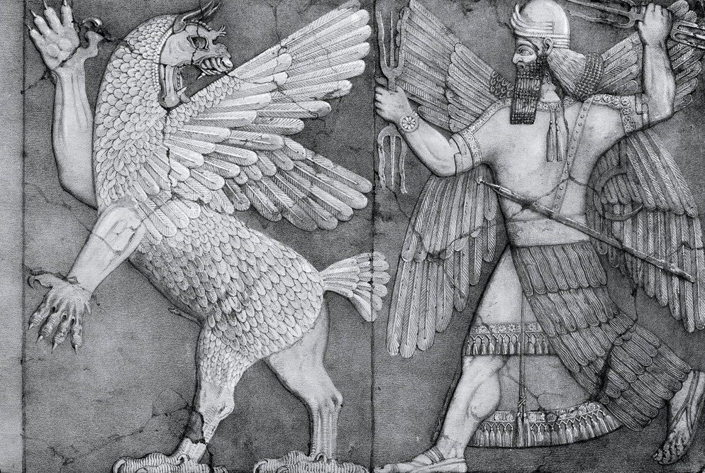 Bogovi su se okupili da bi između sebe pronašli najhrabrijeg i najsnažnijeg, koji je sposoban da pobedi suparnička božanstva. Marduk, tada veoma mlad bog, bio je izabran i obećano mu je zvanje vrhunskog boga ako u toj misiji uspe. Pripremajući se za bitku, napravio je luk i strele, malj, bacio munju ispred sebe, ispunio telo vatrom, ispleo mrežu u koju je uhvatio Tiamatu, uvezao četiri vrste vetra da mu ne bi pobegla i napravio sedam novih opakih vetrova nalik tornadu. Za kraj je čuvao svoje najubojitije oružje, kišni potop. U pohod na bogove je krenuo u svojoj ratnoj kočiji, koju su vukla četiri moćna konja sa ustima punim otrova. On je u ustima je držao magiju, a u jednoj šaci bilje koje će mu služiti kao lek protiv otrova.