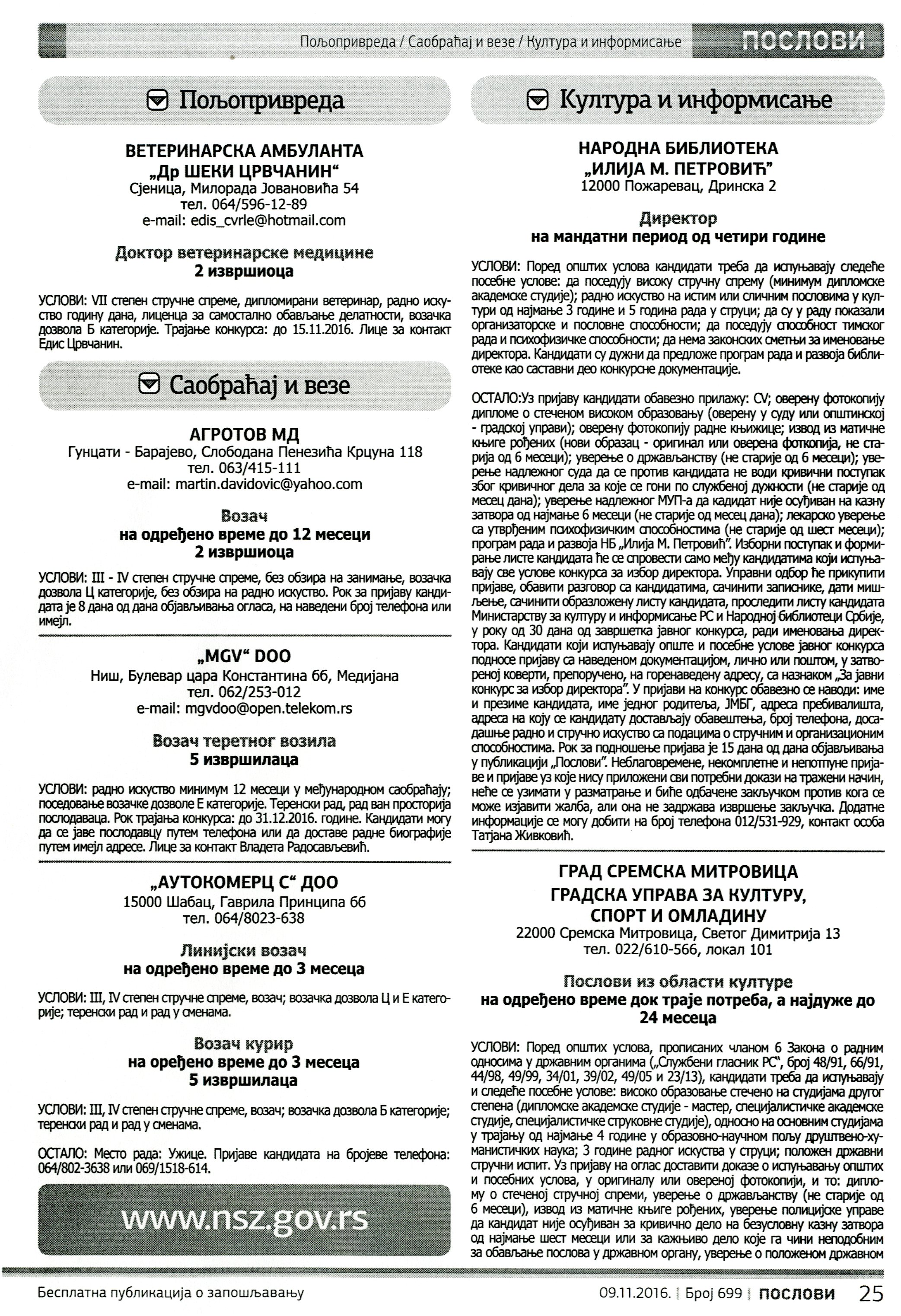 Народна библиотека „Илија М. Петровић“ Пожаревац расписала је конкурс за директора на мандатни период од 4 године. Конкурс је објављен у данашњем броју листа Послови (бр. 699, дана 9. новембра 2016. године) и рок за пријаву је 15 дана од тренутка објављивања.