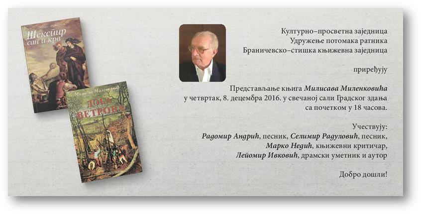 Културно-просветна заједница, Удружење потомака ратника и Браничевско-стишка књижевна заједница приређују представљање књига Милисава Миленковића у четвртак, 8. децембра 2016. године у свечаној сали Градског здања у Пожаревцу, са почетком у 18 часова. Учествују: Радомир Андрић (песник), Селимир Радуловић (песник), Марко Недић (књижевни критичар), Лепомир Ивковић (драмски уметник и аутор). Добро дошли!