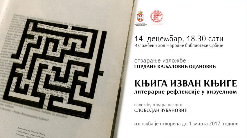 Позивамо вас на отварање изложбе Књига изван књиге, литерарне рефлексије у визуелном ауторке Гордане Каљаловић Одановић, 14. децембра, у 18.30, у Централном холу Народне библиотеке Србије, поводом прославе Дана библиотекара Србије. Изложбу ће отворити песник Слободан Зубановић.