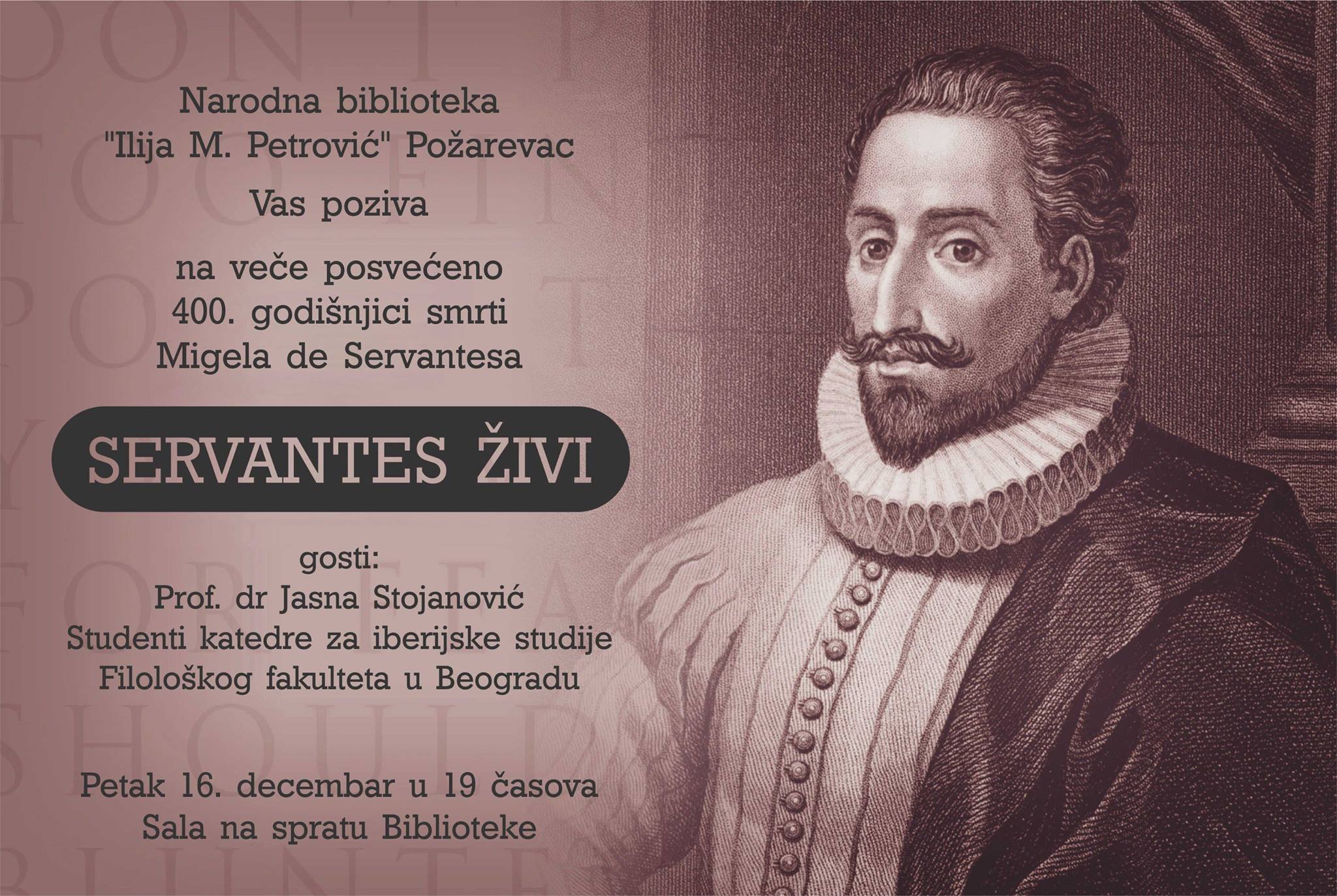 Narodna biblioteka „Ilija M. Petrović“ Požarevac Vas poziva na veče posvećeno 400. godišnjici smrti Migela de Servantesa – Servantes živi. Gosti: prof. dr Jasna Stojanović, studenti katedre za iberijske studije Filološkog fakulteta u Beogradu. Petak 16. decembar 2016. godine u 19 časova, sala na spratu Biblioteke.