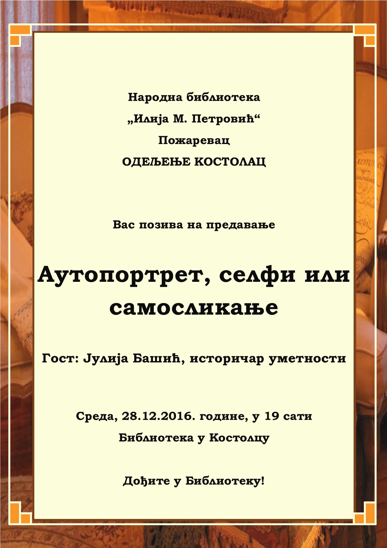 У Библиотеци у Костолцу, огранку Народне библиотеке „Илија М. Петровић“ Пожаревац, у среду 28.12.2016. године, са почетком у 19 сати, историчар уметности Јулија Башић, одржаће предавање под називом „Аутопортрет, селфи или самосликање“. Дођите…