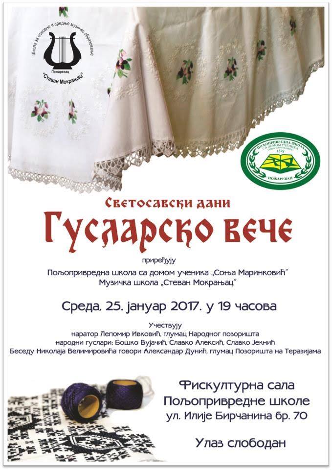 Пољопривредна школа „Соња Маринковић“ и Музичка школа „Стеван Мокрањац“ из Пожаревца поводом Светосавских дана, приређују Гусларско вече, у среду, 25. јануара 2017. године у 19 часова. Учествују: Лепомир Ивковић, глумац Народног позориша и народни гуслари: Бошко Вујачић, Славко Алексић и Славко Јекнић. Беседу Николаја Велимировића говориће Александар Дунић, глумац Позоришта на Теразијама. Место догађаја: Фискултурна сала Пољопривредне школе у Пожаревцу. Улаз слободан.