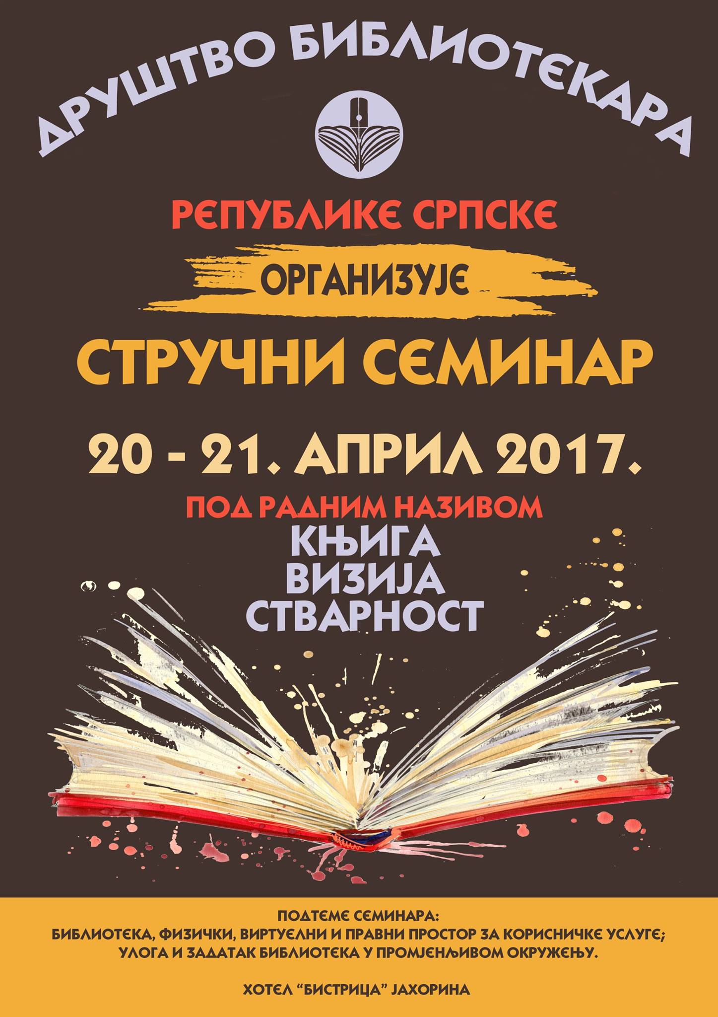 Друштво библиотекара РС организује семинар у Хотелу «Бистрица» Јахорина 20. и 21. априла 2017. године под радним насловом – „КЊИГА, ВИЗИЈА, СТВАРНОСТ“ са следећим под темама :