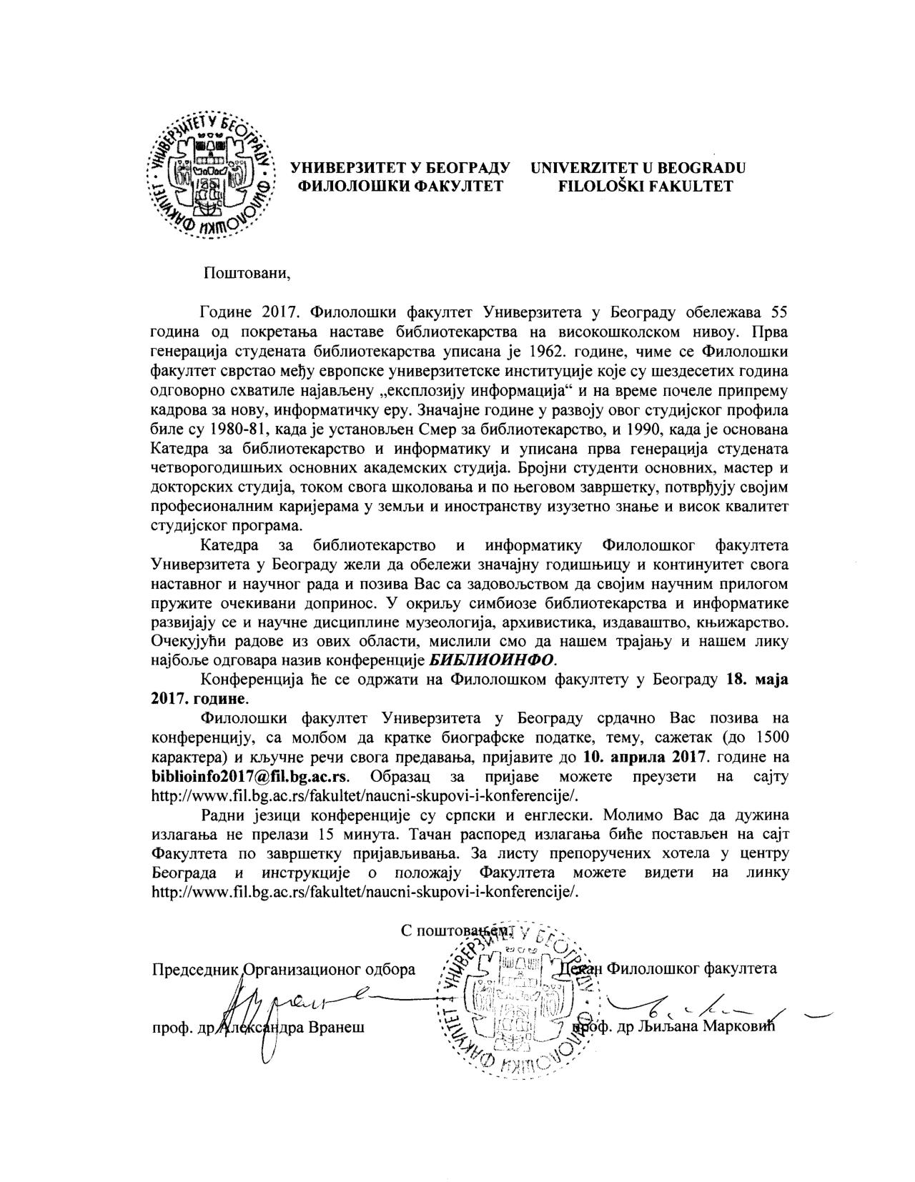 Катедра за библиотекарство и информатику Филолошког факултета Универзитета у Београду обележава значајну годишњицу и континуитет свог наставног и научног рада и зато вас позива да својим научним прилогом пружите допринос. У оквиру симбиозе библиотекарства и информатике развијају се и научне дисциплине: музеологија, архивистика, издаваштво, књижарство, тако да су ове области саставни део конференције БИБЛИОИНФО, која ће се одржати 18. маја 2017. године на Филолошком факултету у Београду. Пријава за радове је до 10. априла. Котизација за учествовање на конференцији је 40 евра у динарској противредности. Више о конференцији можете сазнати овде.