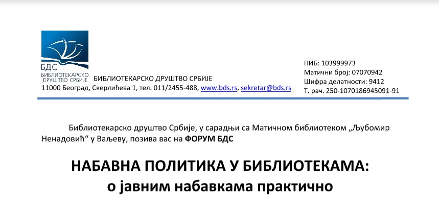 Библиотекарско друштво Србије, у сарадњи са Матичном библиотеком „Љубомир Ненадовић“ у Ваљеву, позива вас на ФОРУМ БДС – НАБАВНА ПОЛИТИКА У БИБЛИОТЕКАМА: о јавним набавкама практично, који ће бити одржан у Библиотеци у Ваљеву у среду 12. 04. 2017. године, од 12 часова.
