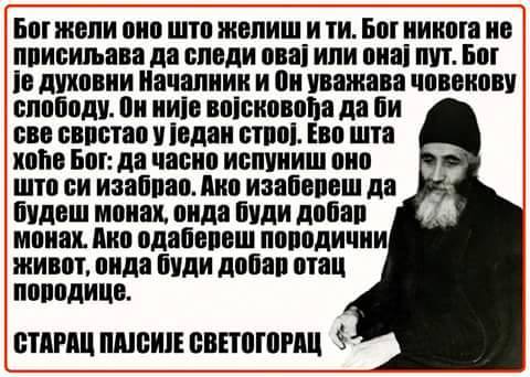 Бог жели оно што желиш и ти. Бог никога не присиљава да следи овај или онај пут. Бог је духовни Началник и Он уважава човекову слободу. Он није војсковођа да би све сврстао у један строј. Ево шта хоће Бог: да часно испуниш оно што си изабрао. Ако изабереш да будеш монаш, онда буди добар монах. Ако одабереш породични живот, онда буди добар отац породице. – Старац Пајсије Светогорац