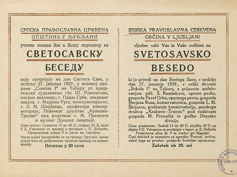 Фебруара 1938. од чланова црквеног хора основано је Православно црквено певачко друштво; први предсједник је био познати словеначки привредник и културни радник Рајко Огрин, директор Занатске банке; 1939. га је на том мјесту наслиједила руска емигранткиња Антонина Фрост, удовица унив. проф. Д. Фроста.