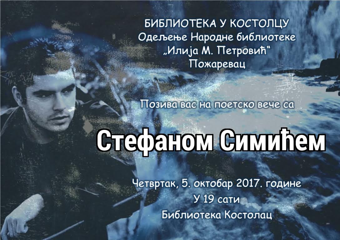 У Библиотеци у Костолцу, Одељењу Народне библиотеке „Илија М. Петровић“ Пожаревац, наш млади песник и есејиста Стефан Симић, одржаће поетско вече под називом „Театар искрености“. Уз Стефанове стихове и есеје, у пратњи гитаре Милана Цековића, очејује вас једно дивно вече. Четвртак, 5. октобар 2017. године, у 19 сати, Библиотека Костолац – добро нам дошли!