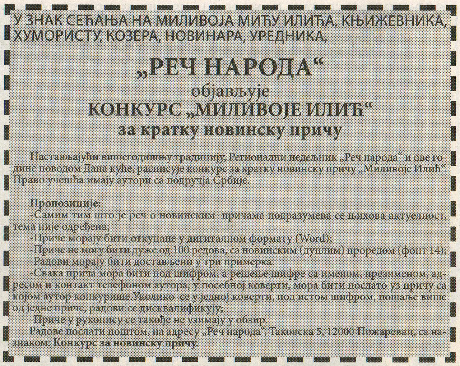 У пожаревачком листу „Реч народа“ (уторак, 5.12.2017.) објављен је конкурс „Миливоје Илић“ за кратку новинску причу, у знак сећања на Миливоја Мићу Илића, књижевника, хумористу, козера, новинара и уредника. Прошле године прва награда додељена је аутору Миодрагу Лазаревићу из Пожаревца за причу под насловом „Другарчина“ коју можете прочитати овде.