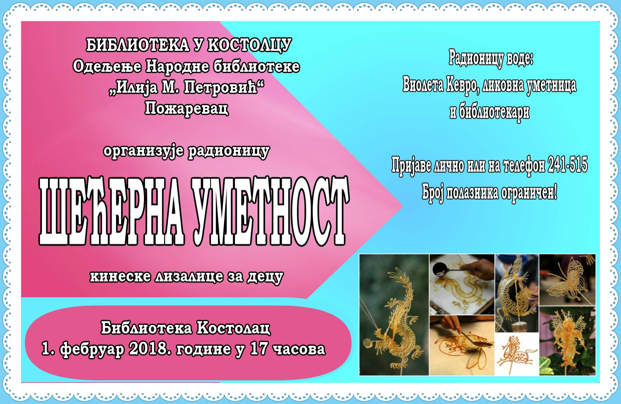 За први дан зимског распуста, 1. фебруар 2018. године, Библиотека у Костолцу, Одељење Народне библиотеке „Илија М. Петровић“ Пожаревац припрема веома лепу радионицу – Шећерна уметност: кинеске лизалице за децу. Циљ радионице је да се деци покаже да уметност може да се искаже на различите начине и са различитим материјалима.
