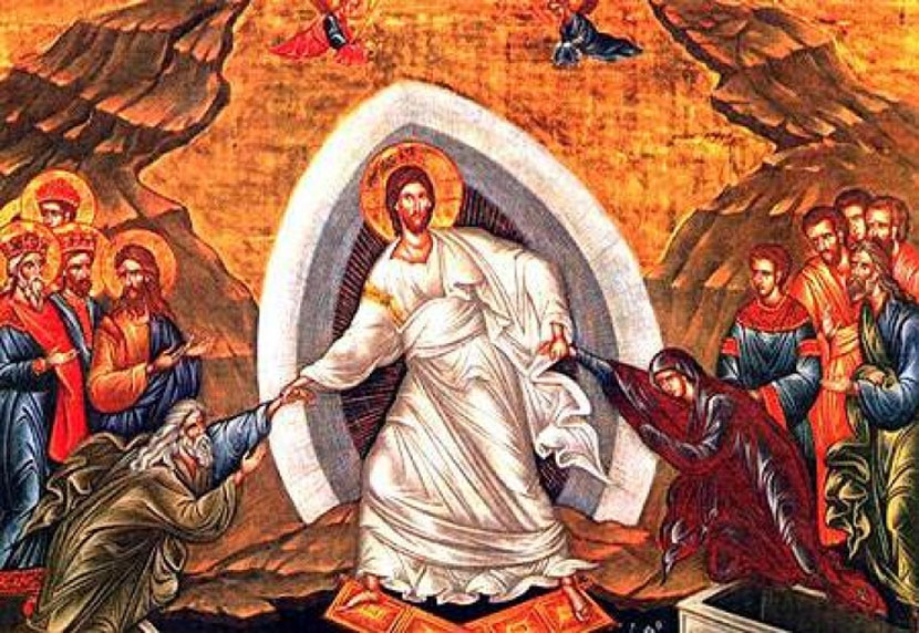 Na kamenu je sedeo anđeo Gospodnji, sa licem kao munja i odelom belim kao sneg. Stražari vojnici su ukočeni od straha. Anđeo blagovesti je rekao mironosicama: „Ne bojte se, jer znam da Isusa raspetoga tražite“.