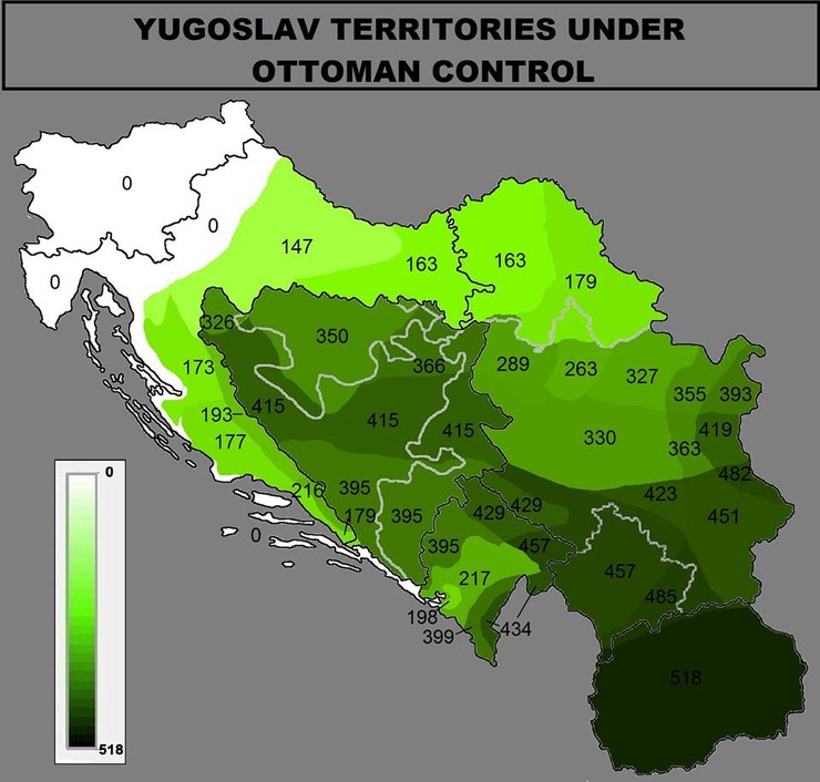 Karta tadašnjih južnoslovenskih zemalja je sa 518 godina na teritoriji današnje Makedonije najtamnije zelena, a zatim svetli nijansu po nijansu, da bi stigla do teritorije današnje Slovenije, koja se beli od nule, ne snežne, već godina turske vladavine. Posle makedonske zelene, najtamnija je ona na Kosovu, jer zapravo sa 485 godina najduže je „pod Turcima“ bilo od svih srpskih teritorija. Vojvodina, koja je bila najkraće, podeljena je na „zapadnih“ 163 godine i „istočnih“ 179.