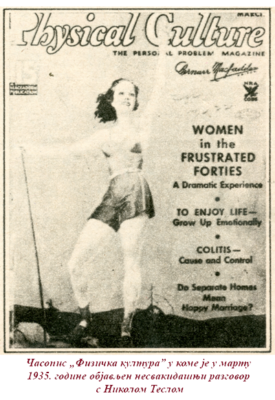„Још две године и напунићу осамдесет. Осећам се одлично, као двадесетогодишњак!”, рекао је Никола Тесла на почетку разговора са Џорџом Корнерсом за амерички часопис„Физичка култура”. Поред савета како се обући за лето, реклама стила „заштитите се од ћелавост”, у марту 1935. године појавио се и интервју с „електронским магом”. Новинара Корнерса занимало је како његов славни савременик, чија је заслуга што је наша епоха прерасла у машинску еру, пуни батерије свог тела.
