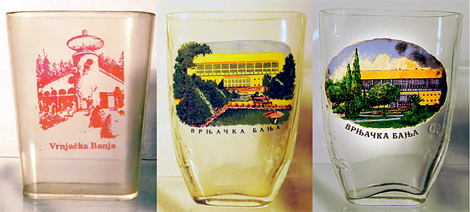 Обавезна бањска успомена биле су разгледнице и фото-албуми са бањским мотивима које су се расклапале попут хармонике, или листале, омиљени су били и пирографисане дрвене кутије, рамови за слике, табакере, муштикле и, наравно, бањске чаше и футроле од рафије. И посуђе је служило да подсети госта где је био, разне шерпе, лончићи, тигањи, џезве, плитки и дубоки тањири, послужавници…