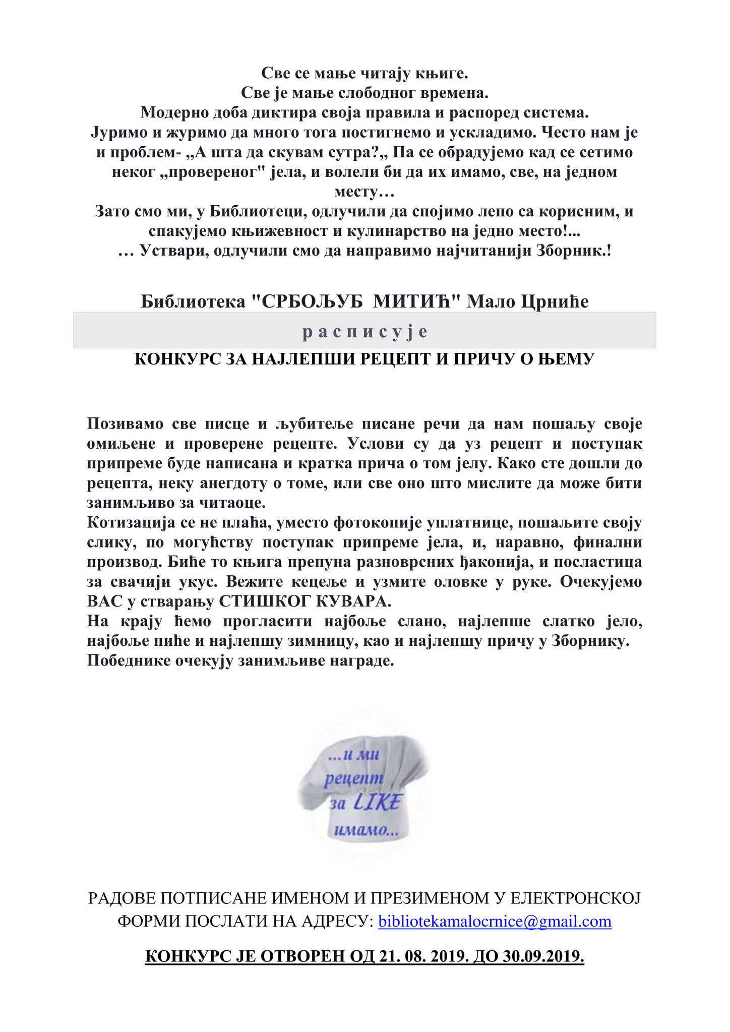 Библиотека „Србољуб Митић“ Мало Црниће расписује Конкурс за најлепши рецепт и причу о њему. Радове слати на адресу: bibliotekamalocrnice@gmail.com до 30.09.2019. године.