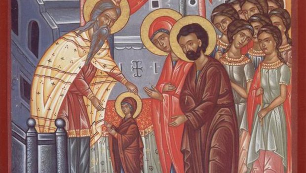 Bogorodica Marija je kao trogodišnje dete, u skladu sa zavetom roditelja Joakima i Ane da će ako budu imali porod dati bebu u hram, dovedena u Jerusalim i uvedena u hram.