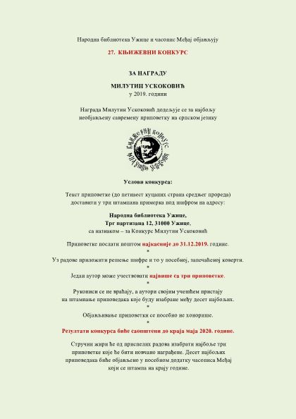 Народна библиотека Ужице и часопис Међај објављују двадесет седми књижевни Конкурс за награду МИЛУТИН УСКОКОВИЋ у 2019. години. Награда Милутин Ускоковић додељује се за најбољу необјављену савремену приповетку на српском језику.