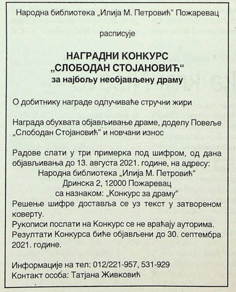 Народна библиотека „Илија М. Петровић“ Пожаревац расписује наградни конкурс „Слободан Стојановић“ за најбољу необјављену драму. Рок доставе радова до 13. августа 2021. године. Више информација на сајту Библиотеке у Пожаревцу.