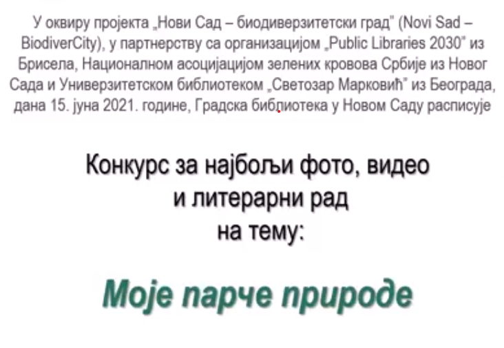 У оквиру пројекта „Нови Сад – биодиверзитетски град” (Novi Sad – BiodiverCity), у партнерству са организацијом „Public Libraries 2030” из Брисела, Националном асоцијацијом зелених кровова Србије из Новог Сада и Универзитетском библиотеком „Светозар Марковић” из Београда, дана 15. јуна 2021. године, Градска библиотека у Новом Саду расписује Конкурс за најбољи фото, видео и литерарни рад на тему: Моје парче природе у три категорије: