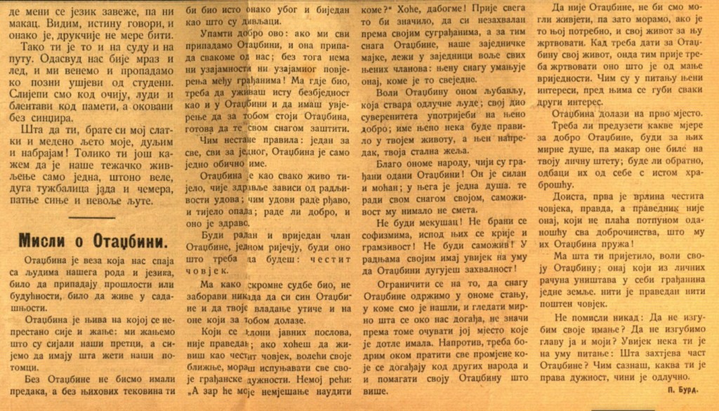 У часопису Отаџбина (политичко-информативни лист, Сарајево, 1907-1908; 1911-1914), власник и оснивач Петар Кочић у уводнику првог броја написао је: