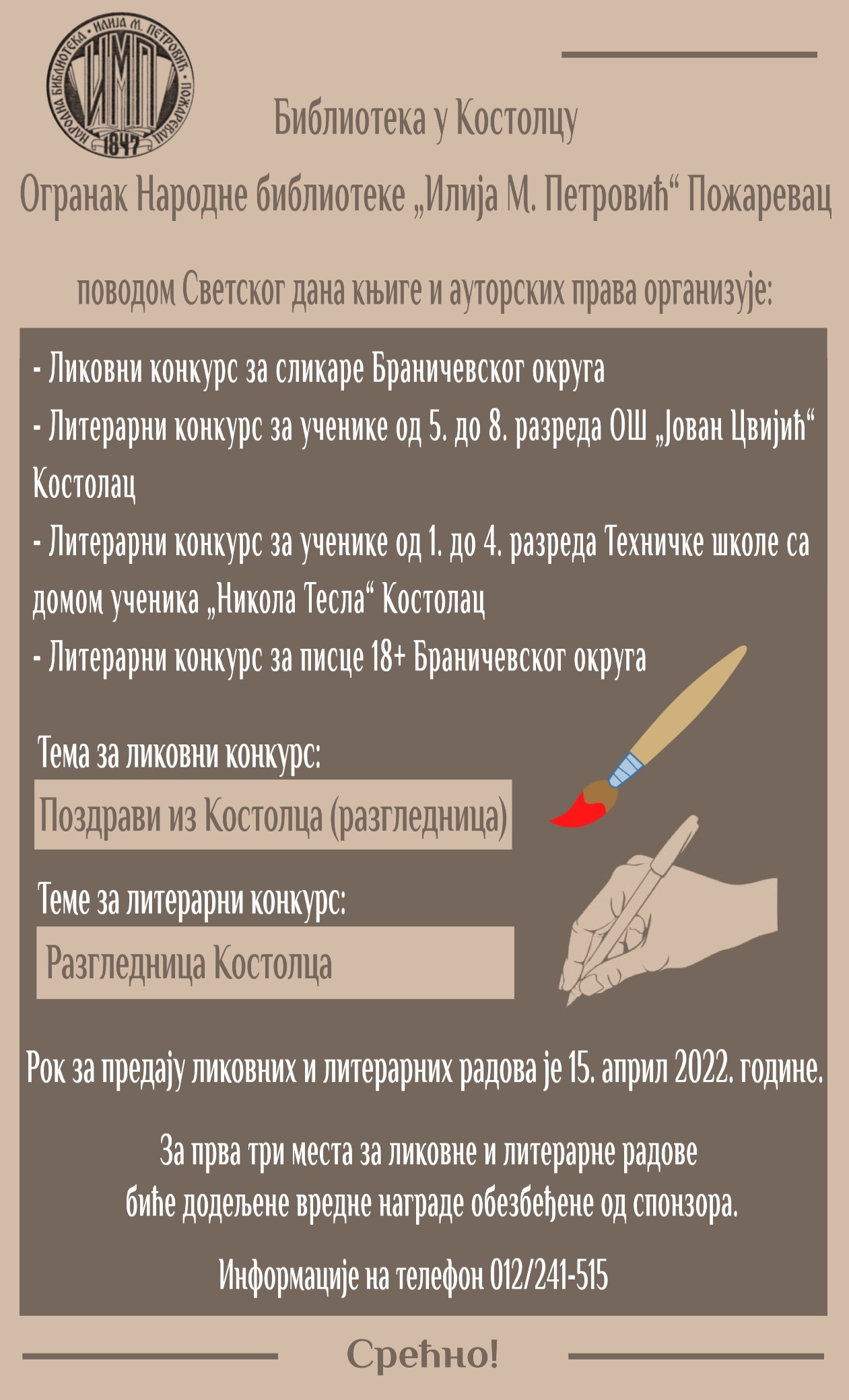 Уручивање награда одржаће се у петак, 22. априла 2022. године, у Библиотеци у Костолцу.
