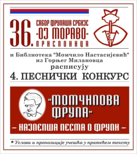 Савет Сабора фрулаша Србије „ОЈ МОРАВО“, у сарадњи са Библиотеком „Браћа Настасијевић“ из Горњег Милановца поводом 36. Сабора, који ће се одржати 22. до 23. јула 2023. у Прислоници код Чачка, расписује: ЧЕТВРТИ ПЕСНИЧКИ КОНКУРС „МОМЧИЛОВА ФРУЛАʼʼ ЗА НАЈЛЕПШУ ПЕСМУ О ФРУЛИ.