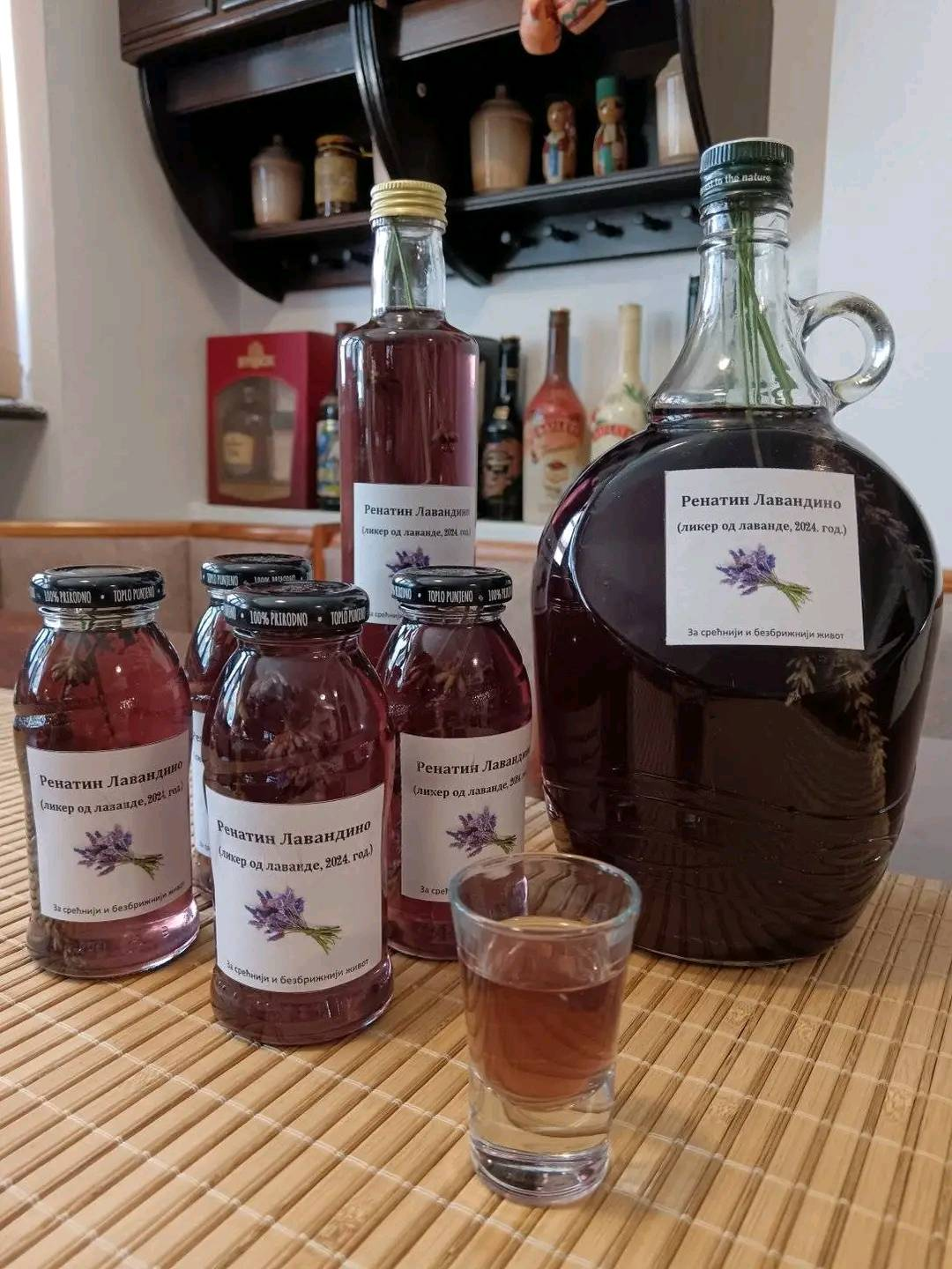Ko želi može da naruči. Sirup od lavande 800 dinara litar. Liker od lavande 1400 din litar, 400 dinara flašica od 250 ml.