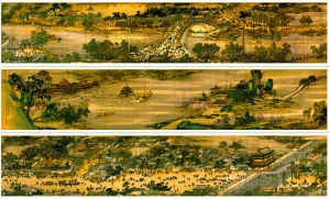 Једно од најпознатијих уметничких дела које заузима почасно место, а уједно и најзанимљивији историјски извор података на свету, јесте свитак по имену Шетња обалом реке на задушнице (на кинеском Čingming šanghe tu)[1]. Свитак је осликан десетак година пре пада Каифенга[2] у руке варвара. Дело је истакнутог дворског уметника Џанга Зедуана[3]. Овај упечатљив и оригиналан свитак, од тренутка свог настанка постао је предмет расправа царева, колекционара, сликара и песника. На свитку је приказан град Каифенг, у периоду мира, у пролеће, негде око 1120. године и верно приказује пасторалне пределе, открива начин живота свих слојева друштва, од богатих до сиромашних, као и различите економске активности у руралним срединама и граду. Нуди приказе архитектуре и гардеробе из тог периода. Тема велича празнични дух и приказује атмосферу на Ћингминг фестивалу[4].