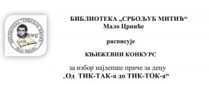 Библиотека „Србољуб Митић“ Мало Црниће расписује књижевни конкурс за избор најлепше приче за децу „Од Тик-Так-а до Тик-Тока-а“. Конкурс је отворен од 7. јануара 2024. до 14. фебруара 2024. године. На конкурс се могу слати објављене и необјављене приче за децу написане на српском језику. Један аутор може послати највише три приче, откуцане ћириличним писмом Times New Roman – фонт 12, потписане шифром у једном фолдеру, а разрешење шифре (име и презиме, адреса и контакт телефон) на мејл srbazmaj1973@gmail.com