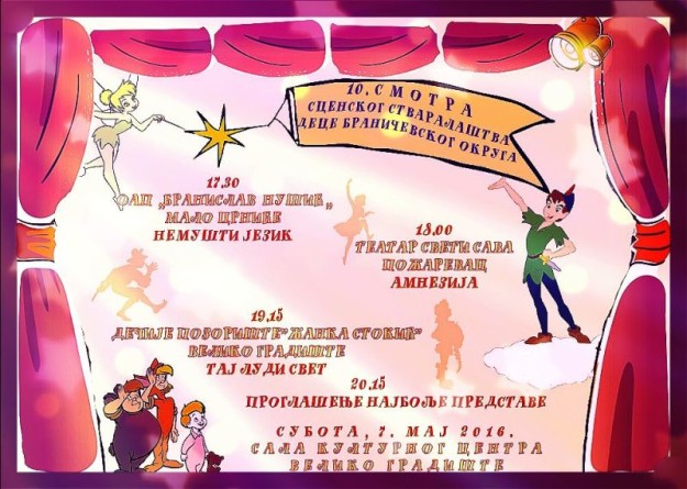 Glumci Teatra „Sveti Sava“ iz Požarevca nastupiće u subotu, 7. maja na 10. Smotri scenskog stvaralaštva dece Braničevskog okruga.