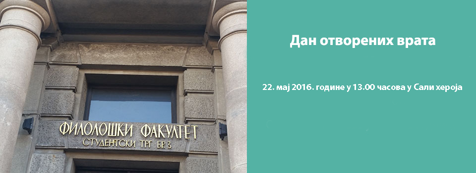 Дан отворених врата за будуће студенте Филолошког факултета биће организован у просторијама Факултета 22. маја 2016. године са почетком у 13.00 часова у Сали хероја Филолошког факултета (Студентски трг 3). После уводних објашњења декана Филолошког факултета у Сали хероја будући студенти Филолошког факултета имаће прилику да разговарају са представницима научних дисциплина за чије су студирање заинтересовани.